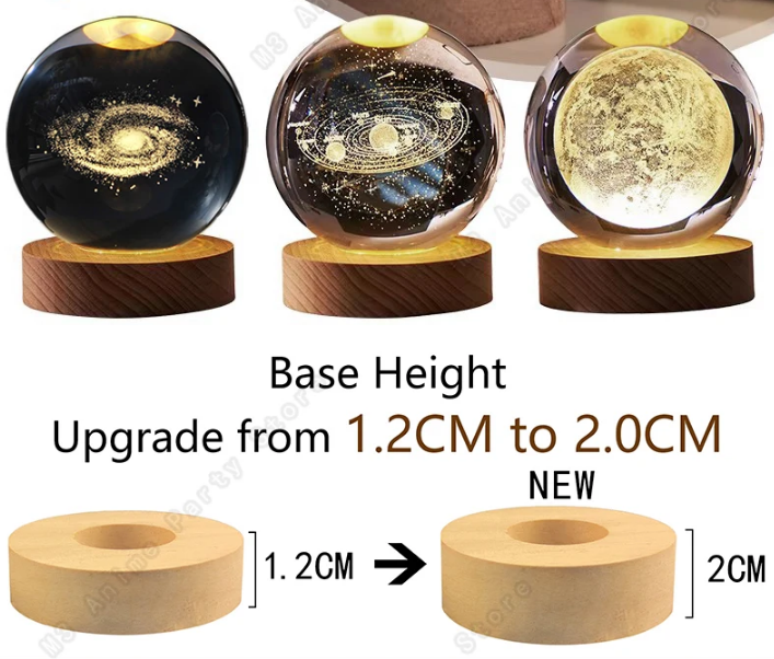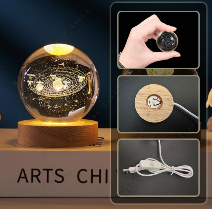 Trasforma ogni ambiente in un'esperienza cosmica con la nostra Lampada Galassia 3D in Cristallo. Una sfera di cristallo da 5cm con incisione laser 3D che cattura la bellezza dei pianeti e delle galassie, poggiata su una base in legno naturale con illuminazione LED multicolore.